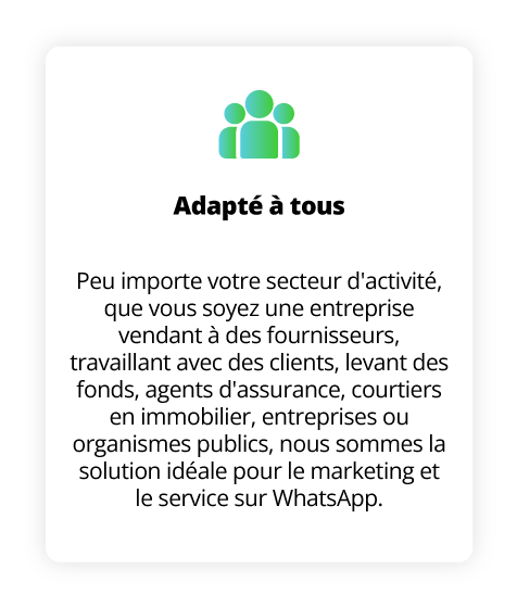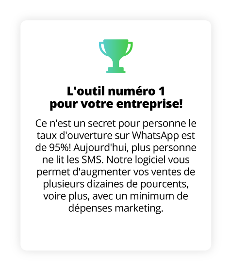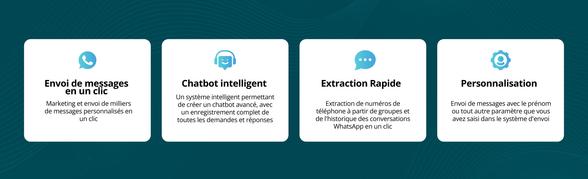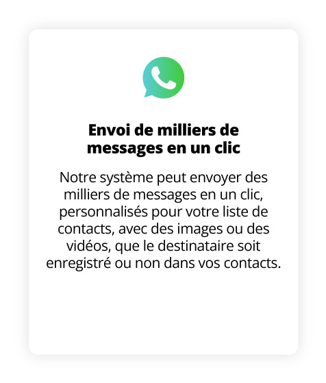Toutes les opérations de marketing et d'envoi se font via WhatsApp ! Vous pouvez envoyer des milliers de messages en un clic, y compris le nom du destinataire, des images et des documents. Il est également possible de créer un chatbot pour des réponses automatiques personnalisées à votre entreprise